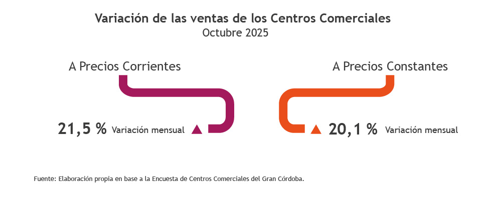 Durante el mes de octubre de 2025, las ventas en los principales centros comerciales del Gran Córdoba registraron una variación positiva a valores corrientes como a valores constantes.