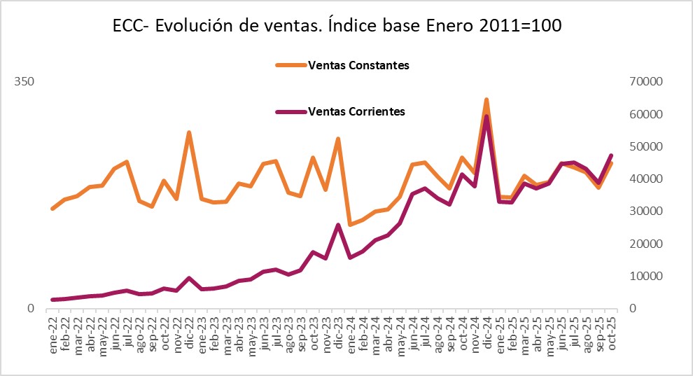 Las ventas corrientes fueron de 42.051,6 millones de pesos, lo que significó una variación positiva respecto a septiembre de 2025 del 21,5%. Por otra parte, las ventas a precios constantes, sin considerar el efecto de los precios, fueron de 200,1 millones de pesos, lo que representó, una variación también positiva, del 20,1% respecto al mes anterior.